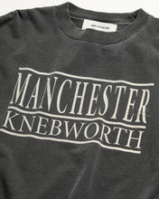 This long-sleeve T-shirt features a souvenir-style print design celebrating the birthplaces of “Manchester” and “Knebworth” culture.