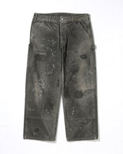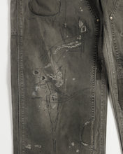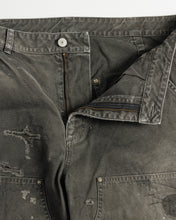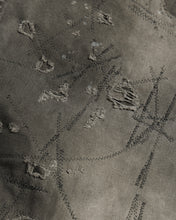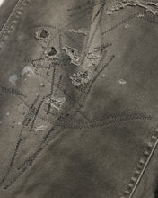 Extensive distressing is applied across the entire garment, with all damaged areas carefully repaired using houndstooth stitching.