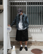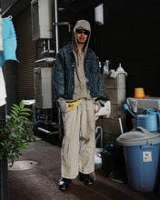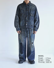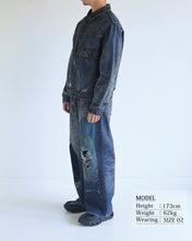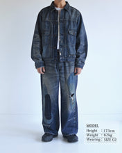 全体的に濃色エイジングとブリーチ加工で仕上げ、随所に激しくダメージを施し複数の当布でパッチワークリメイクしております。