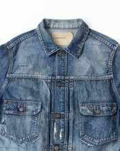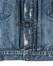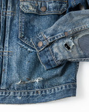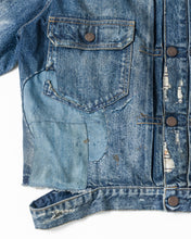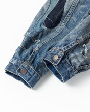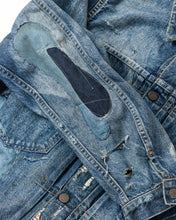 Finished with deep-toned aging and bleaching throughout, featuring heavy distressing and intricate patchwork remade with multiple patch fabrics.